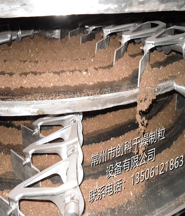 湿物料自加料器连续地加到干燥器上部第一层干燥盘上,带有耙叶的耙臂作回转运动使耙臂作回转运动使耙叶连续地翻抄物料。物料沿指数螺旋线流过干燥盘表面,在小干燥盘上的物料被移送到外缘,并在外缘落到下方的大干燥盘外缘,在大干盘上物料向里移动并从中间落料口落如下一层小干燥盘中。大小干燥盘上下交替排列,物料得以连续地流过整个干燥器。中空的干燥盘内通入加热介质,加热介质形式有饱和蒸汽、热水和导热油,加热介质由干燥盘的一端进入,从另一端导出。已干物料从^后一层干燥盘落到壳体的底层,^后被耙叶移送到出料口排出。湿份从物料中逸出,由设在顶盖上的排湿口排出,真空型盘式干燥器的湿气由设在顶盖上的真空泵口排出。从底层排出的干物料可直接包装。通过配加翅片加热器、溶剂回收冷凝器、袋式除尘器、干料返混机构、引风机等辅机,可提高其干燥的生产能力,干燥膏糊状和热敏性物 料,可方便地回收溶剂,并能进行热解和反应操作。